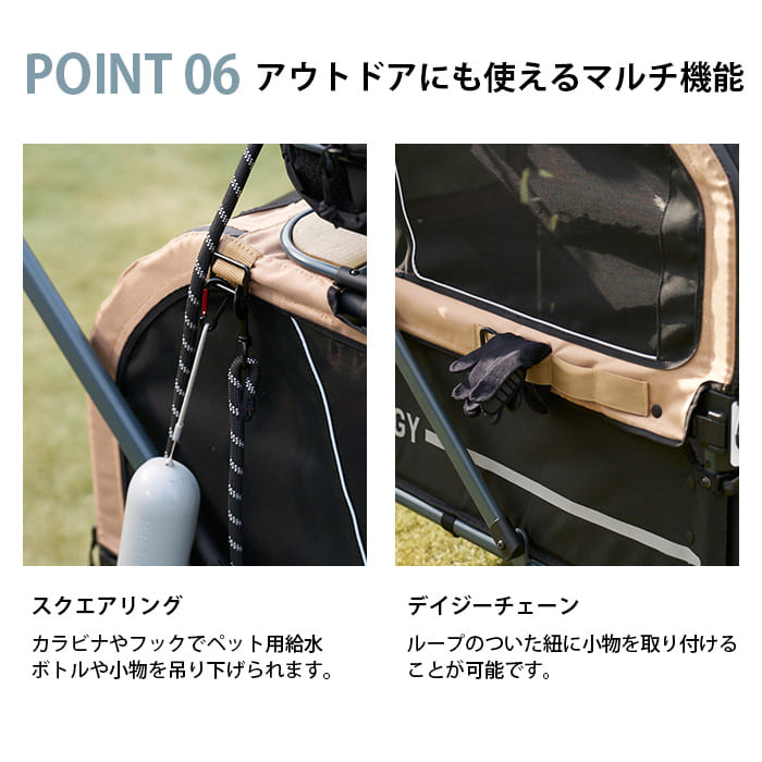 カラビナやフックでペット用給水ボトルや小物を吊り下げられます。