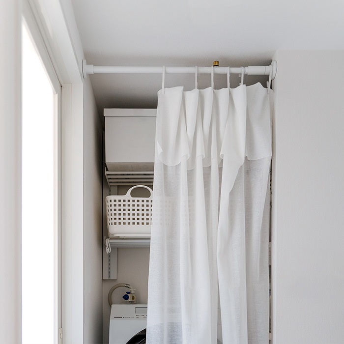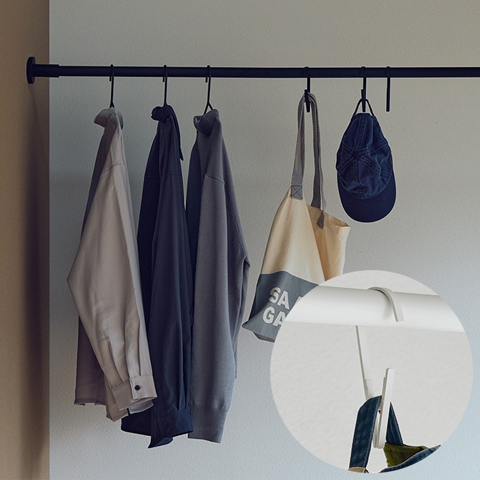 マットな質感のスチールのオプションパーツを組み合わせることで、突っ張り棒をおしゃれなアイテムに昇華しました。