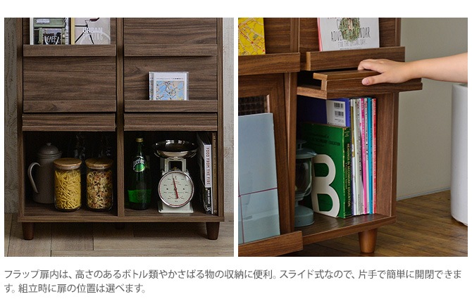 ・フラップ扉内は、高さのあるボトル類やかさばる物の収納に便利。スライド式なので、片手で簡単に開閉できます。
