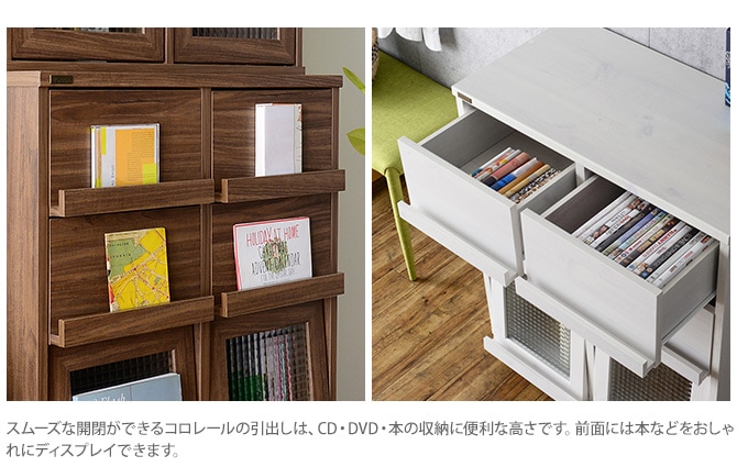 ・スムーズな開閉ができるコロレールの引出しは、CD・DVD・本の収納に便利な高さです。前面には本などをおしゃれにディスプレイできます。