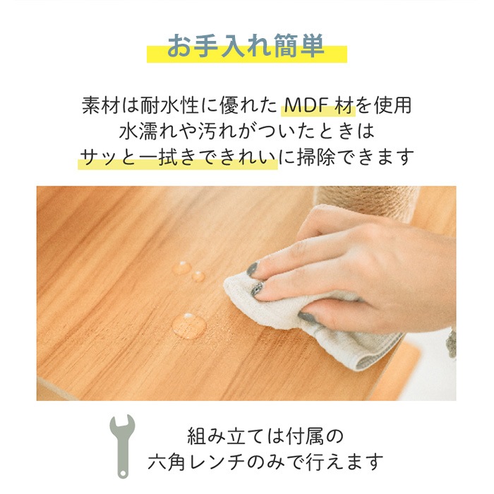 素材は耐久性に優れたMDF材を使用しているので、水濡れや汚れが付いたときはサッと一吹きできれいに掃除できます。