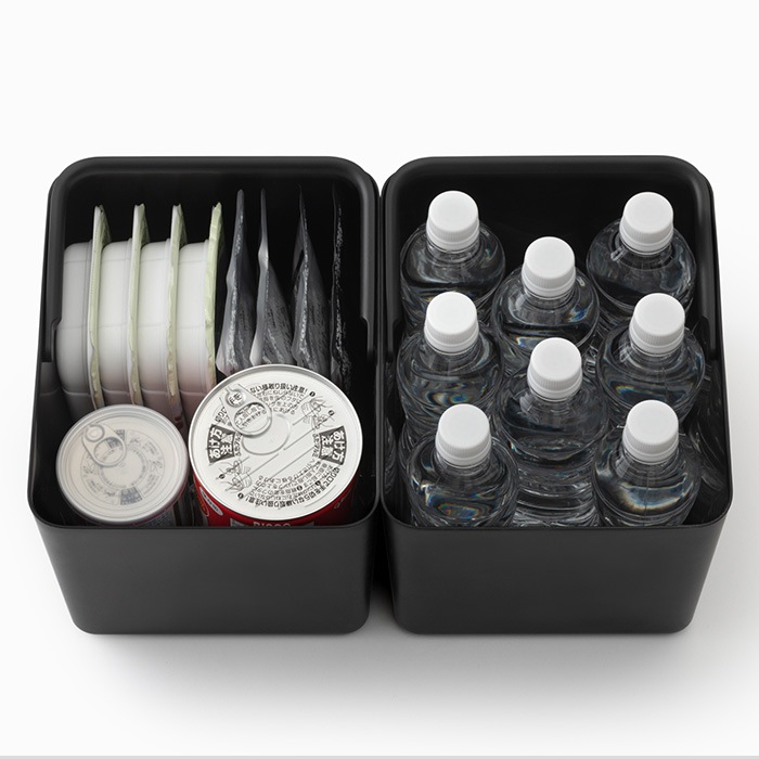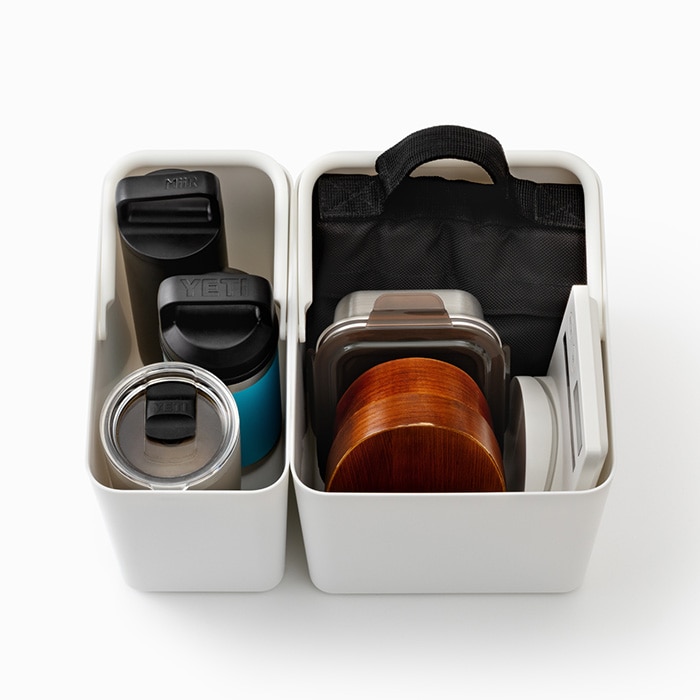 別売りの「フタ付きストックケース 米びつ」のインナーとして、白米とレトルト食品などの仕分けにも使えます。