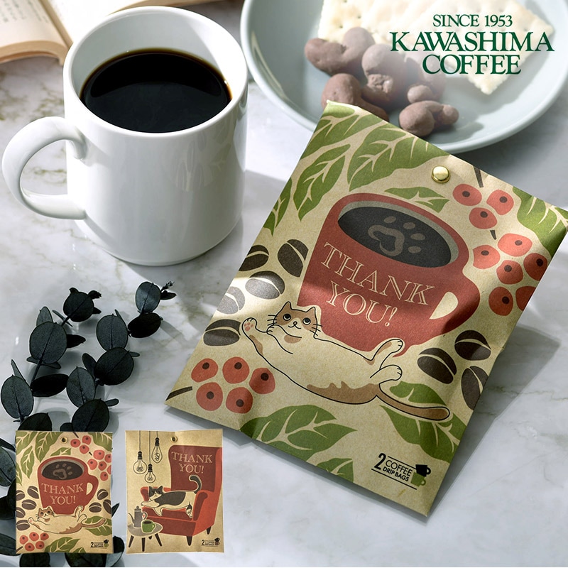 かわいい猫と「THANK YOU」のメッセージが描かれた、封筒型のパッケージに入ったドリップコーヒー。猫好きにはたまらないかわいさで、ついつい見せ置きしたくなるデザインです。これだけで感謝の気持ちが伝えられるので、プチギフトには最適です。