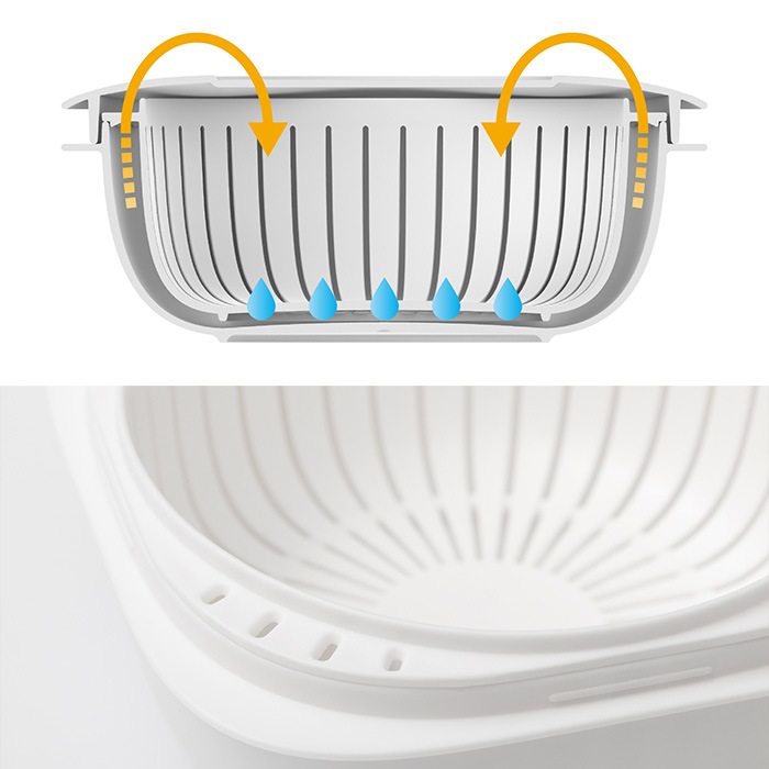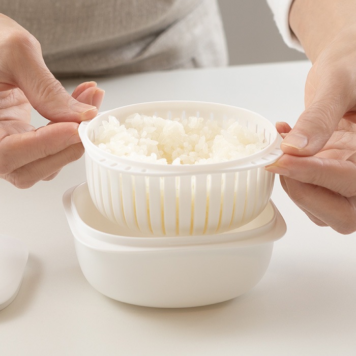 ごはんをふっくら解凍するためのザル型2重構造が特長。