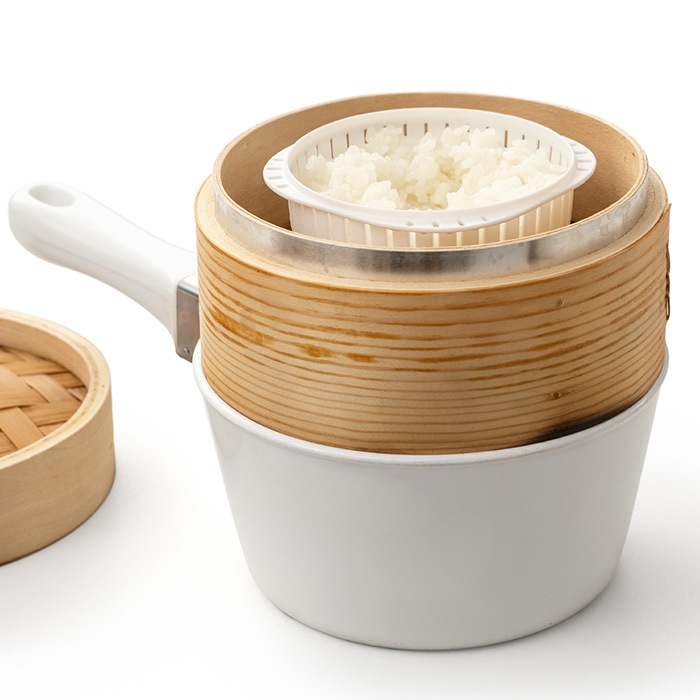蒸気が循環してムラなくふっくら仕上がるザルの二重構造。