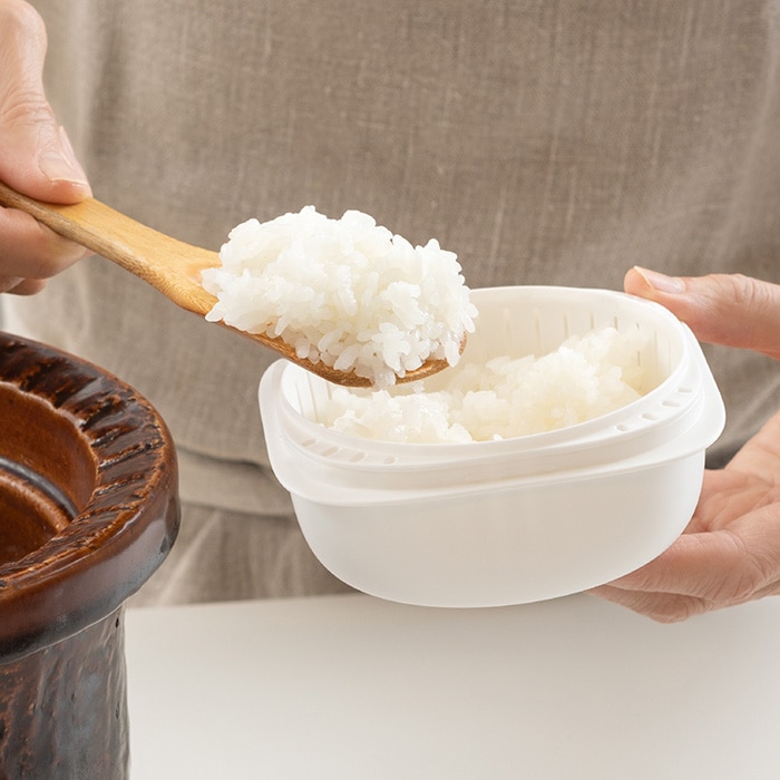 容器はごはんをふっくら解凍するためのザル型2重構造が特長。